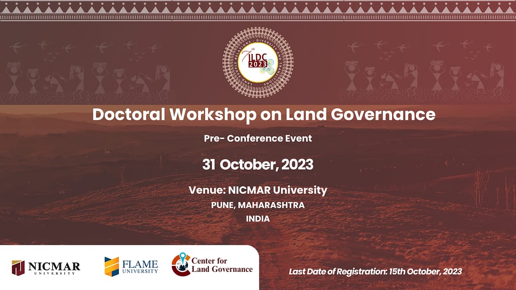 Join us for an exclusive Pre-conference Doctoral Workshop hosted jointly by NICMAR University, FLAME University and Center for Land Governance. The workshop will take place at NICMAR University, Pune on October 31, 2023. It will be followed by 3-days of intellectual learning, research-interactions and deliberations at the 7th India Land and Development Conference at FLAME University during November 1st to 3rd, 2023.